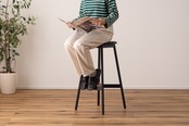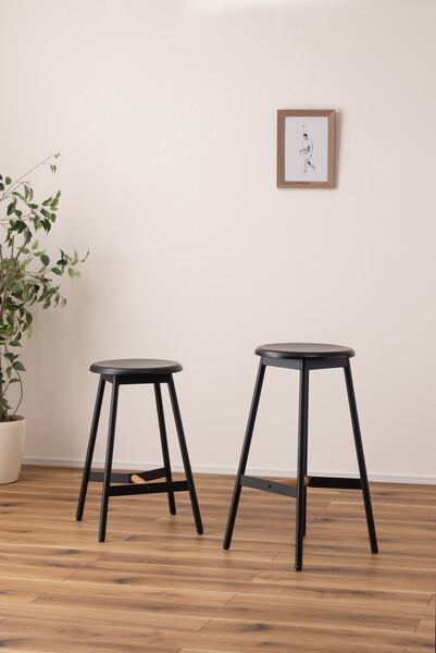 このハイスツールは、シックなブラックのデザインが際立ちます。カフェスタイルのインテリアやキッチン、ダイニングスペースでの使用にぴったりで、洗練された印象を与えるアイテムです。
