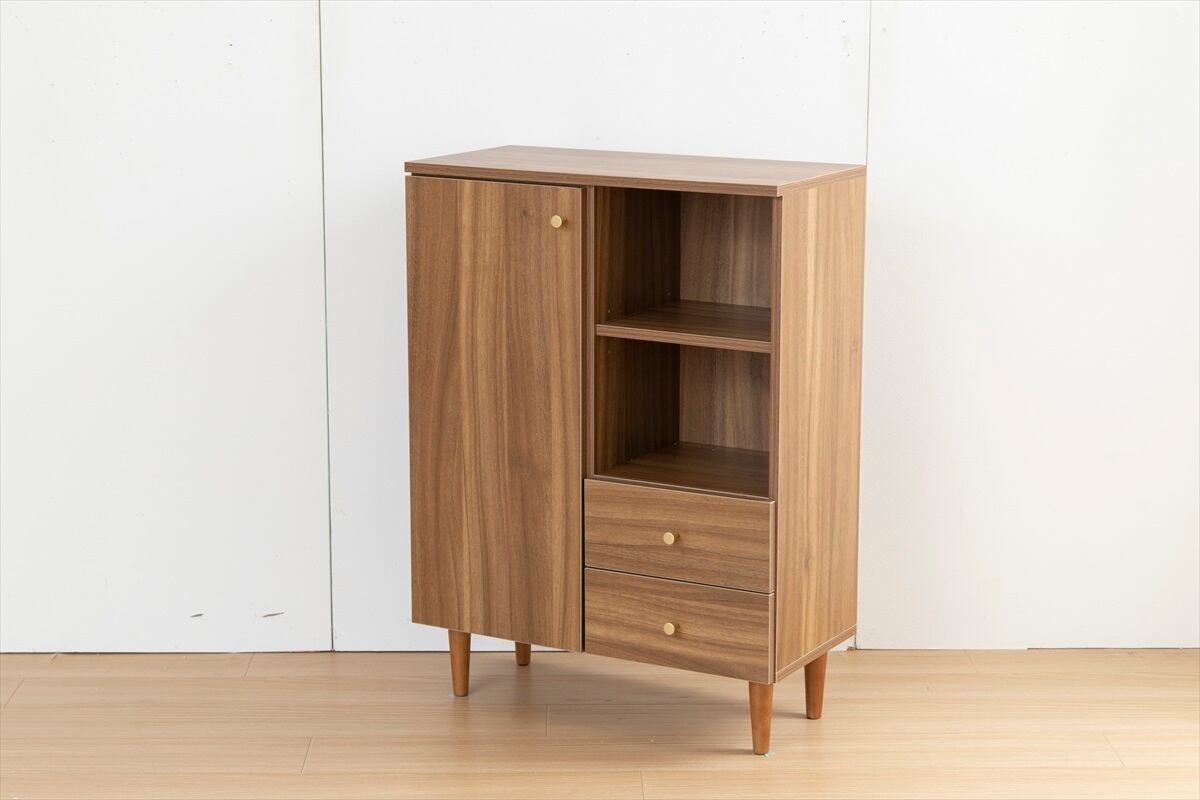 このキャビネットは、現代的なデザインと実用性を兼ね備え、リビングやダイニングにぴったりなアイテムです。脚付きのデザインにより、開放感があり、収納力も抜群です。